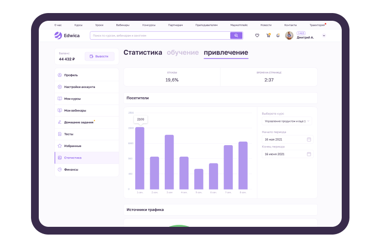 Следи за продвижением своих курсов. При помощи графиков можно анализировать такие показатели как посещаемость страниц курсов, источники трафика, новые посетители, тип устройств, пол посетителей