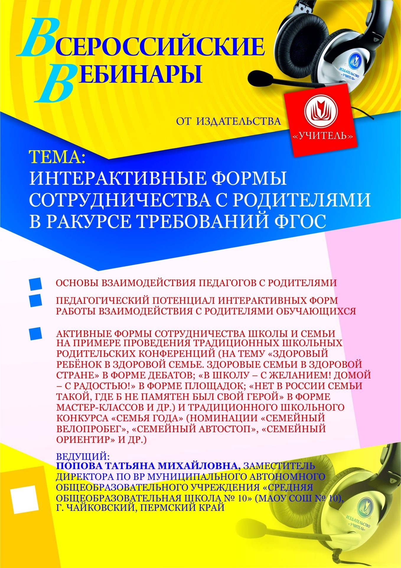 Приглашаем педагогов ОО, школьных учителей, социальных педагогов, классных руководителей, заместителей директора, воспитателей принять участие в offline-вебинаре «Интерактивные формы сотрудничества с родителями в ракурсе требований ФГОС».