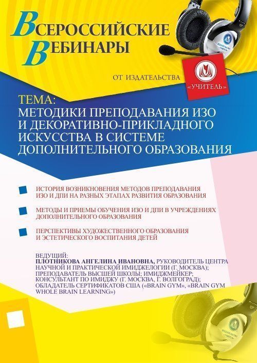 Приглашаем учителям изобразительного и декоративно-прикладного искусства детских школ искусств (ДШИ), студий творчества, педагогам дополнительного образования, вожатым, воспитателям ГПД и другим специалистам, не имеющим педагогического образования принять участие в offline-вебинаре «Методики преподавания ИЗО и декоративно-прикладного искусства в системе дополнительного образования».