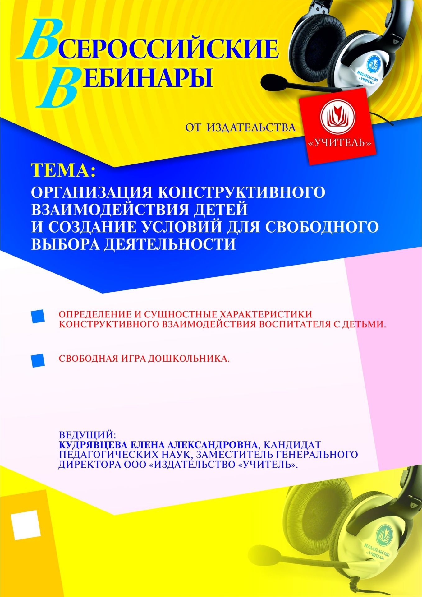Приглашаем воспитателей и руководителей ДОО, методистов, старших воспитателей, педагогов-психологов, родителей принять участие в offline-вебинаре «Организация конструктивного взаимодействия детей и создание условий для свободного выбора деятельности».