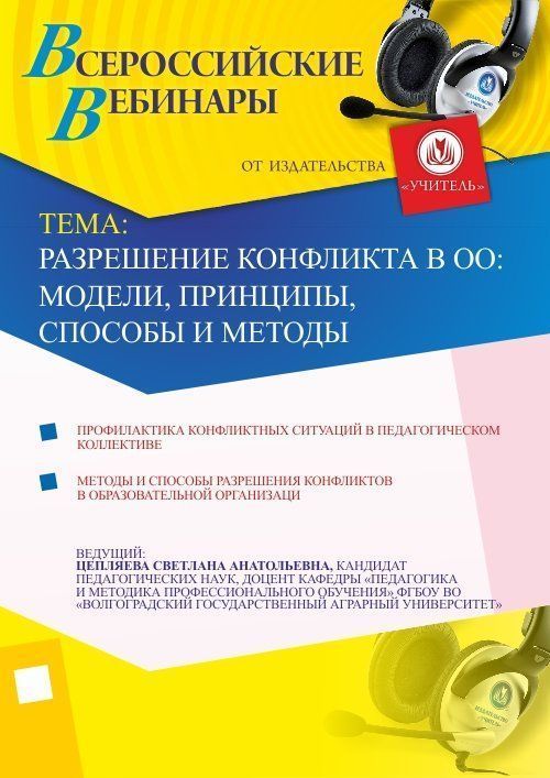 Приглашаем руководителей ОО, заместителей руководителя по УМР и УВР, педагогов и специалистов ОО, педагогов-психологов, методистов, руководителей МО, специалистов органов управления образованием принять участие в offline-вебинаре «Разрешение конфликта в ОО: модели, принципы, способы и методы».