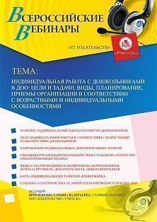 Вебинар Индивидуальная работа с дошкольниками в ДОО: цели и задачи, виды, планирование, приемы организации в соответствии с возрастными и индивидуальными особенностями